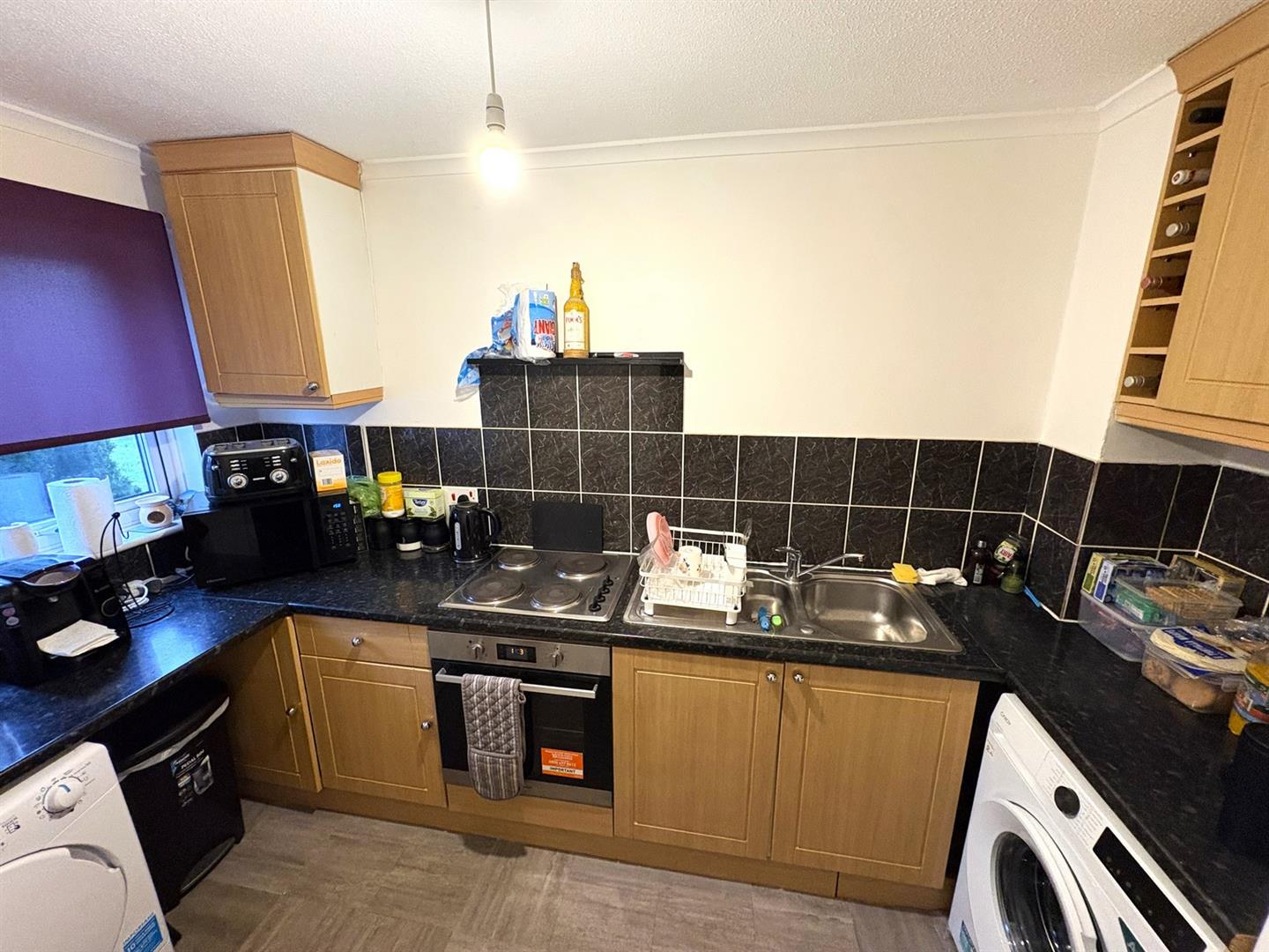 Front aspect UPVC double glazed window, base & wall units with rolled worksurfaces & tiled splashbacks incorporating 1½ bowl stainless sink & mixer tap, electric hob with oven below, space & plumbing for washing machine, space for tumble dryer & fridge/freezer.