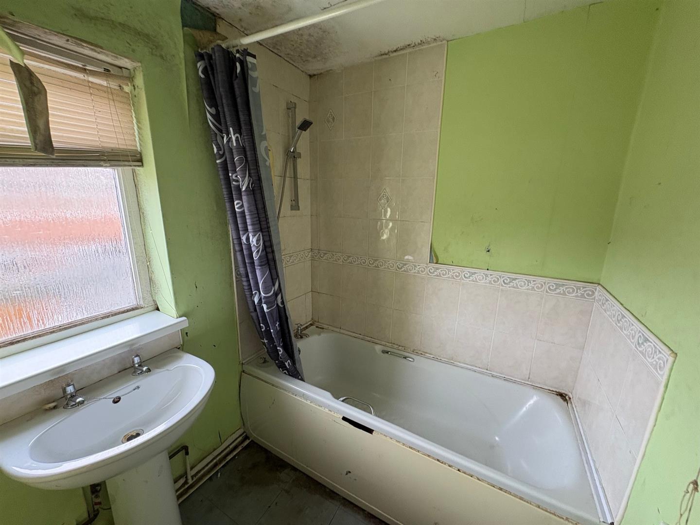 BathroomRear aspect UPVC double glazed window, bath with electric shower over, pedestal wash basin, tiled splashbacks and a radiator.