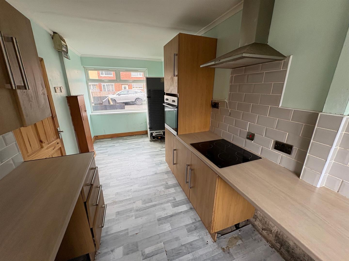 Front & rear aspect UPVC double glazed windows and a side aspect composite door. Base & wall units with rolled worksurfaces and tiled splashbacks incorporating a stainless steel sink & mixer tap, electric hob, built-in oven, space & plumbing for washing machine, laminate flooring and a radiator.