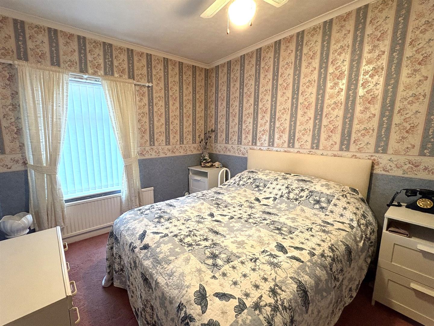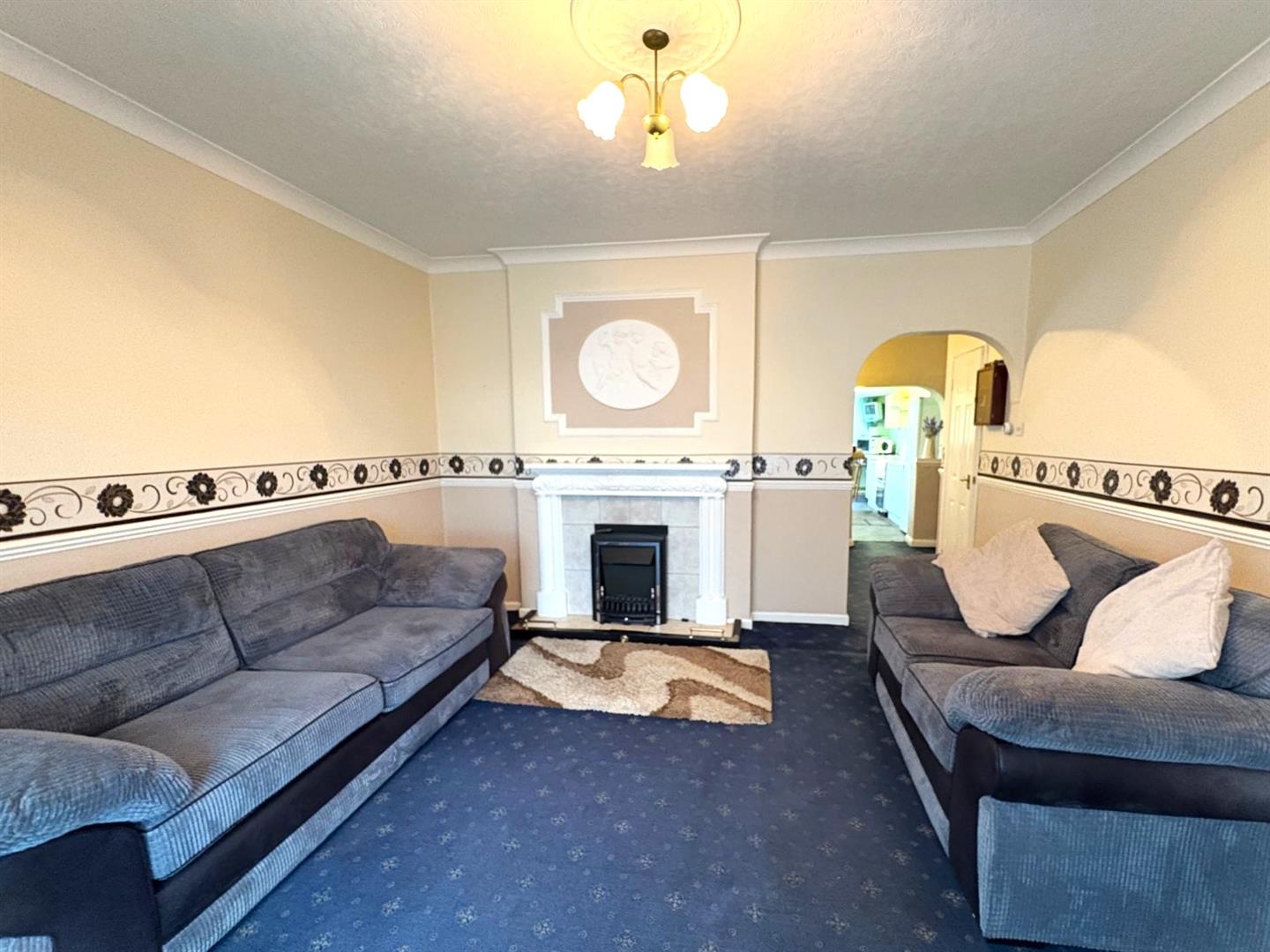 Front aspect UPVC double glazed bay window, feature fireplace with tiled hearth & electric fire, coving, dado rail and a radiator.
