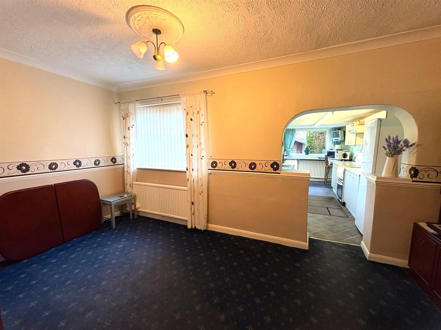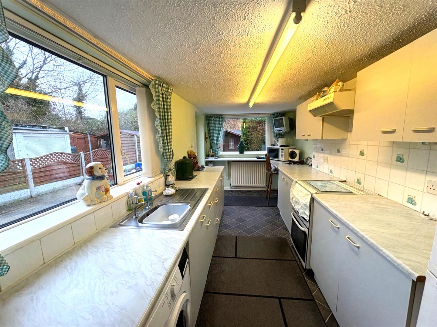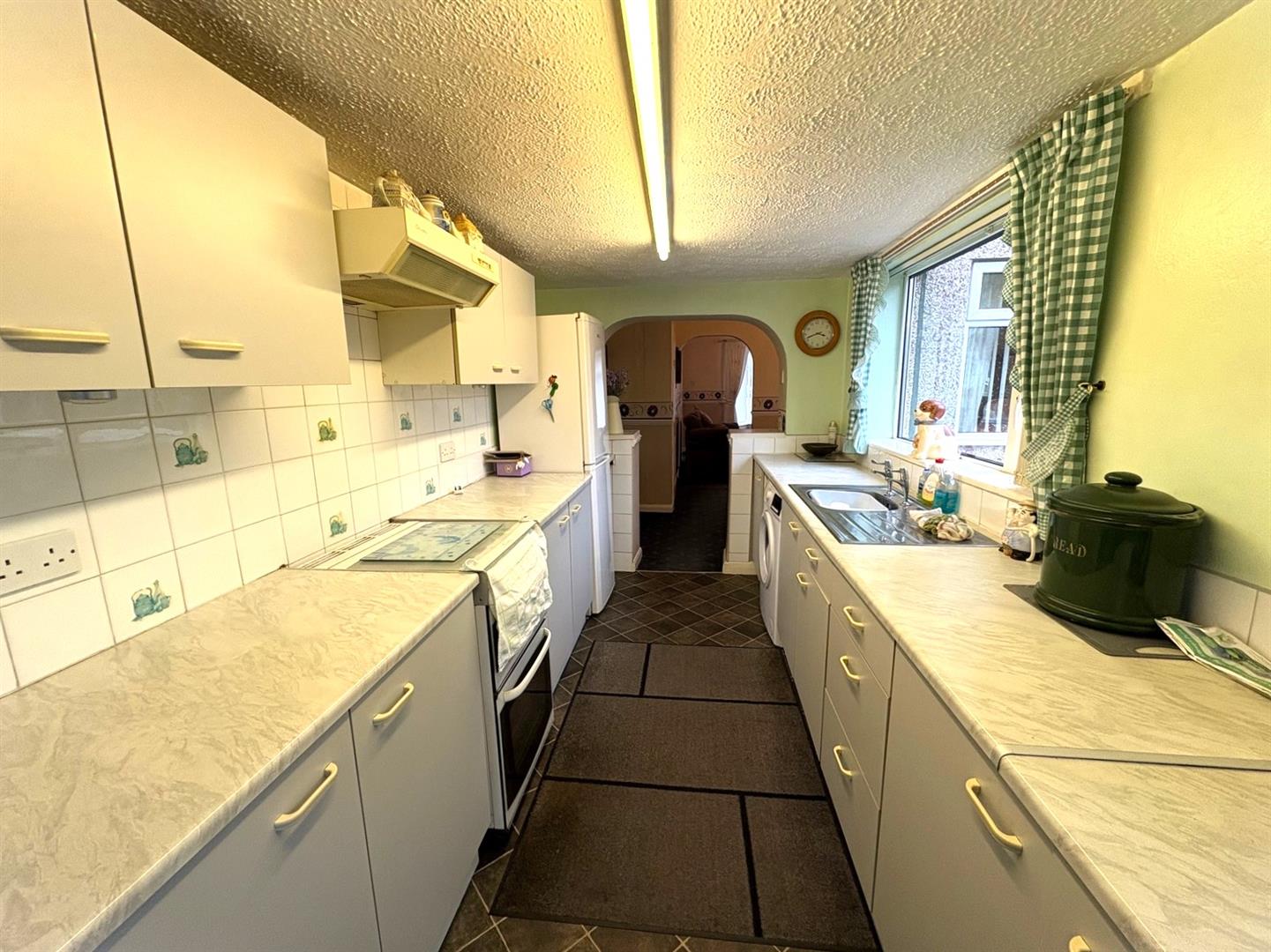 Side & rear aspect UPVC double glazed window and a side aspect UPVC door leading to the garden. A range base & wall units with rolled worksurfaces & tiled splashbacks incorporating a stainless steel sink. Washing machine, space for cooker & fridge/freezer, breakfast bar and a radiator.