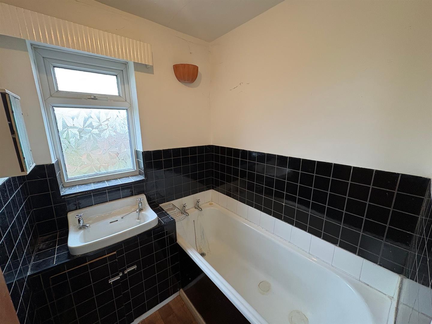 BathroomRear aspect UPVC double glazed window, panel enclosed bath, wash basin and tiled splashbacks.