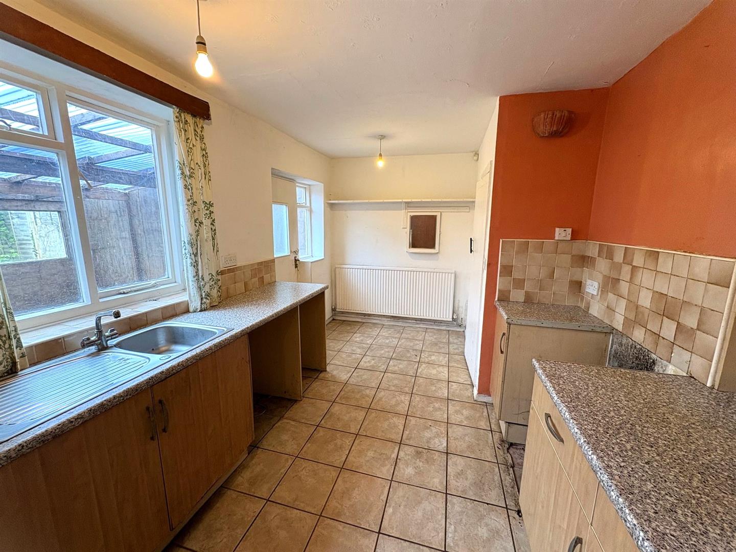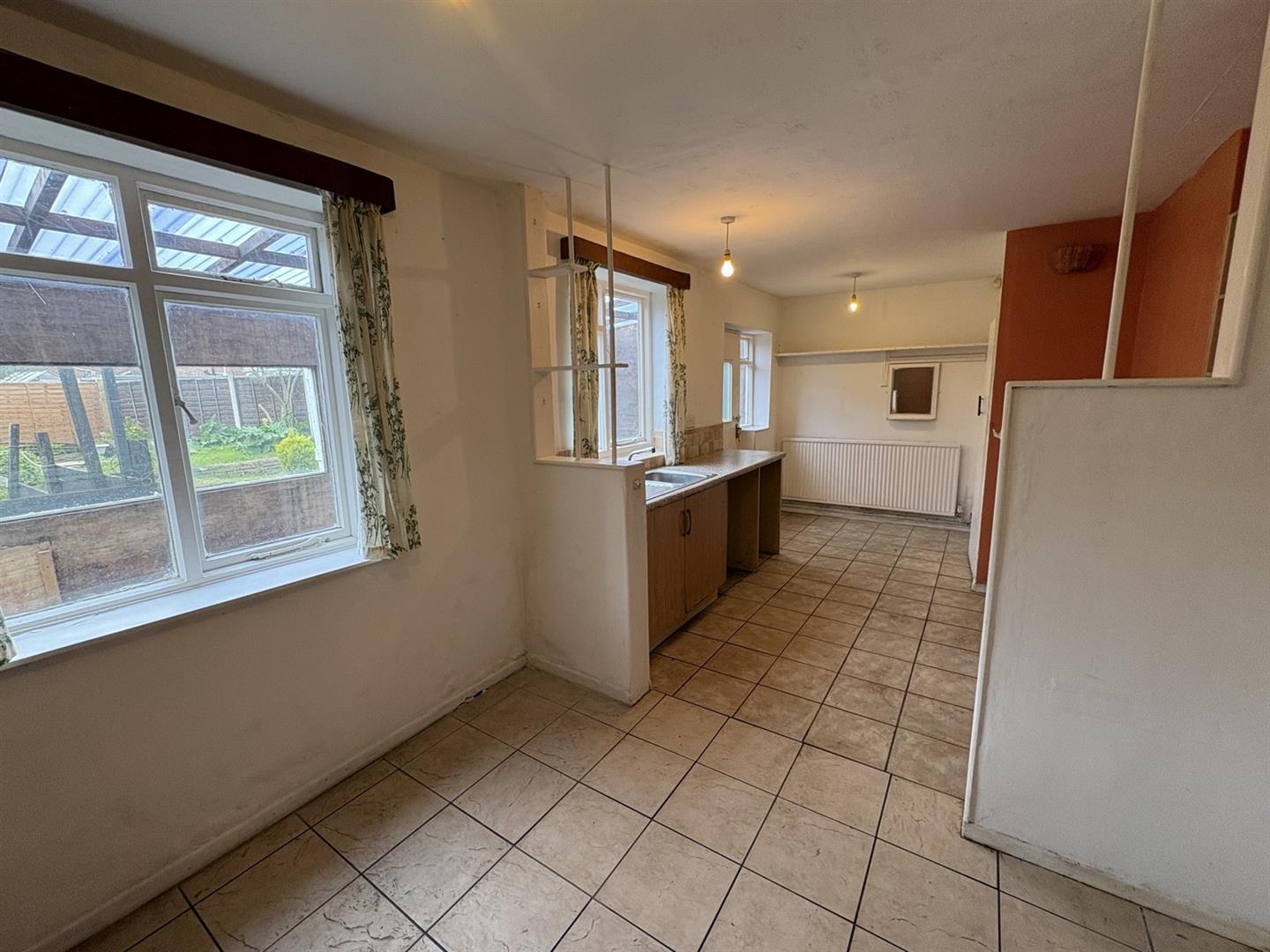 Rear aspect window & door to lean to/garden room. Base & wall units with rolled worksurfaces and tiled splashbacks incorporating a stainless steel sink & mixer tap, space for cooker, space & plumbing for washing machine, pantry, tiled floor and a radiator.