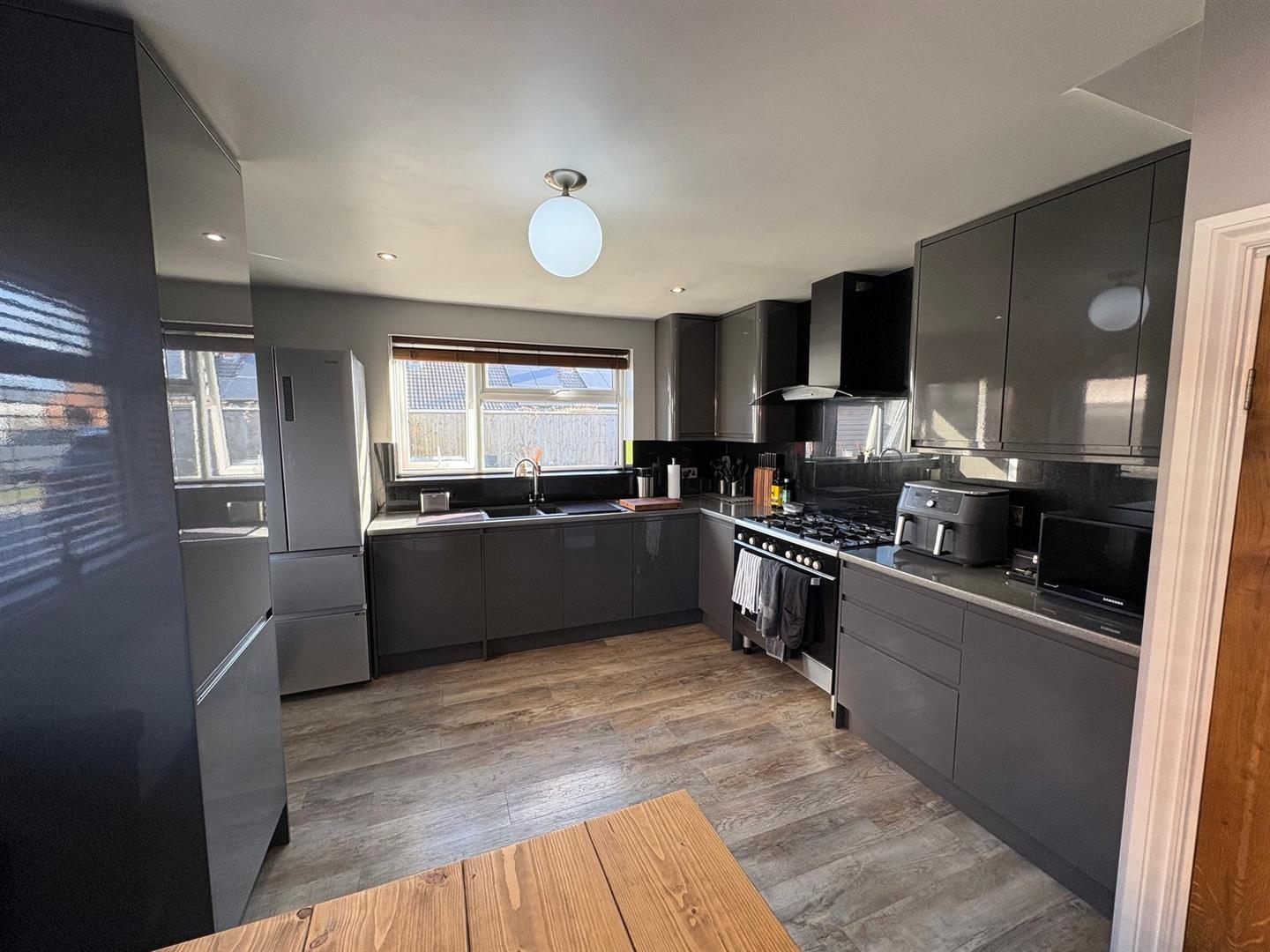 Side & rear aspect UPVC double glazed windows and side aspect UPVC door. A range of grey high gloss base & wall units with rolled worksurfaces and glass splashbacks incorporating 1½ bowl sink unit & mixer tap, gas ranger cooker with extractor hood over. Integrated washing machine, space for fridge/freezer, floor to ceiling unit housing Worcester combi boiler, understair storage cupboard with oak door, spot lights and a radiator.