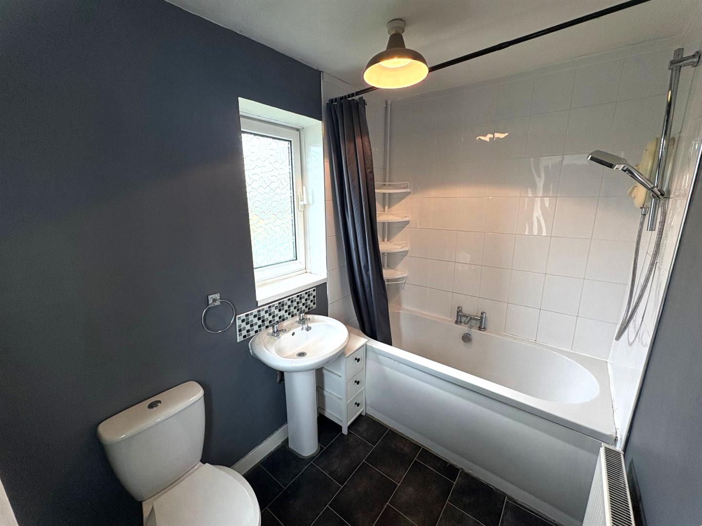 BATHROOMTwo rear aspect UPVC double glazed windows. Modern white suite comprising; panel enclosed bath with electric shower over, pedestal sink and low level WC. Part tiled walls, extractor fan and a radiator.