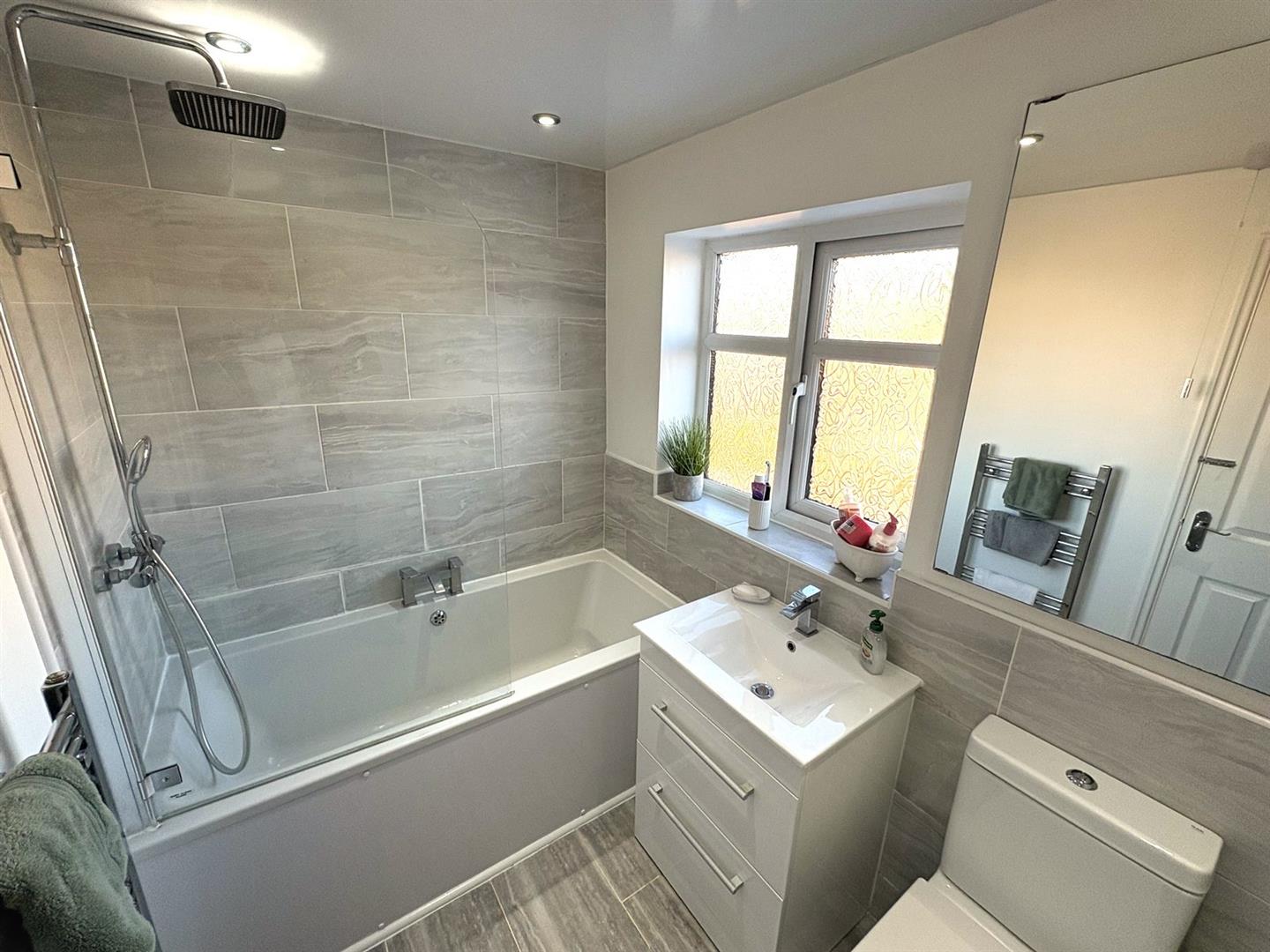 BathroomRear aspect UPVC double glazed window, modern white suite comprising; double ended bath with mixer tap & thermostatic rainfall mixer shower over, vanity unit housing wash basin & a low level WC. Part tiled walls, UPVC clad ceiling with spotlights and a chrome heated towel rail.