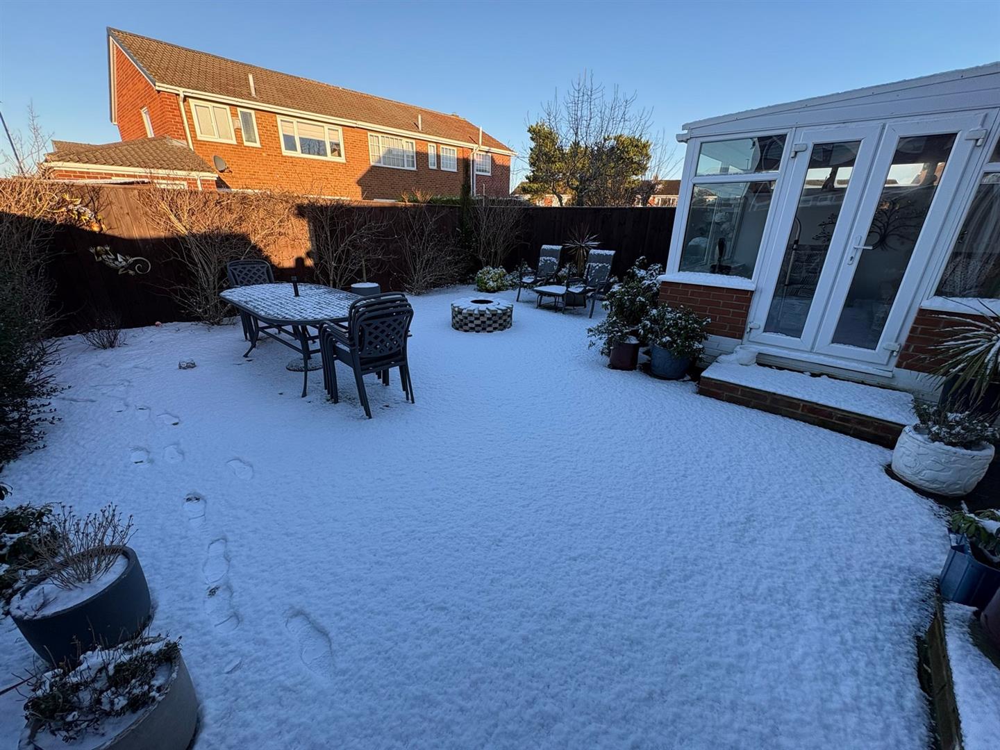 Low level brick wall and UPVC construction with side aspect French doors opening to the garden.
