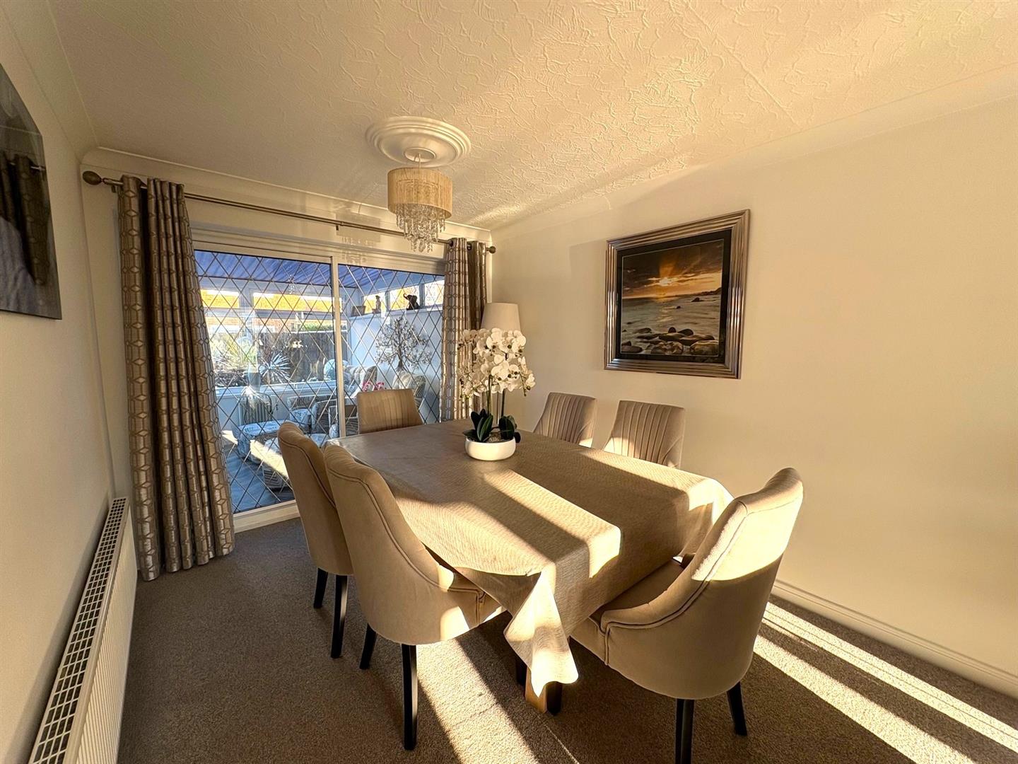 Front aspect UPVC double glazed bow window and rear aspect double glazed patio doors to the conservatory, coving, ceiling roses and a radiator.