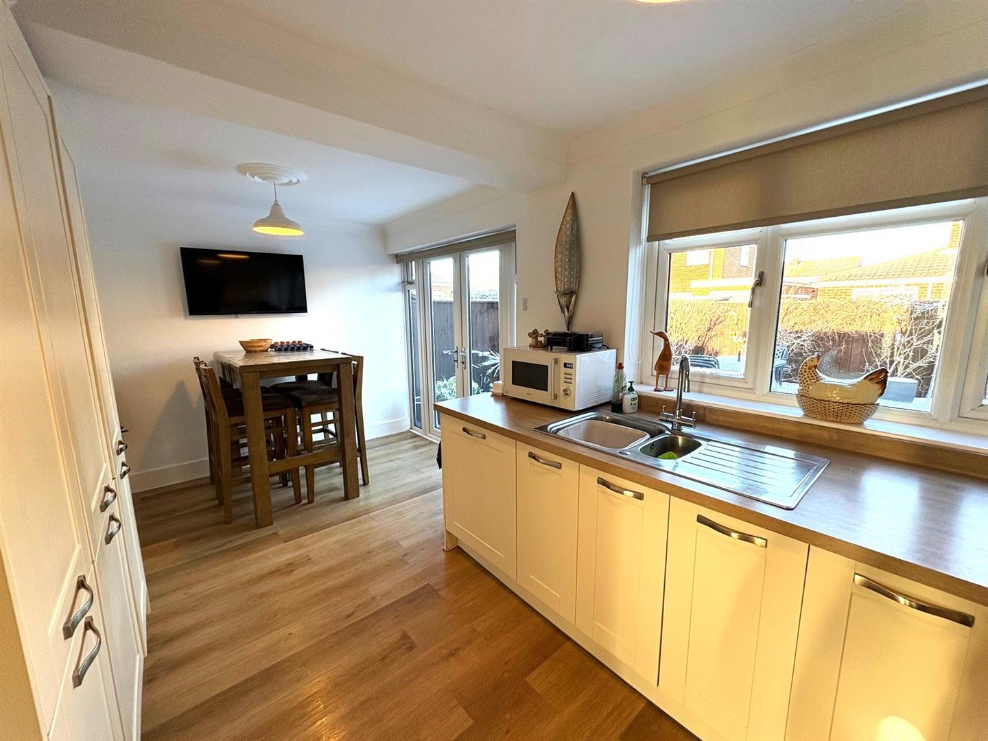 Rear aspect UPVC double glazed window and French doors opening to the garden. A range of base & wall units with wood effect worksurfaces & matching upstand incorporating a 1½ bowl stainless steel sink & mixer tap, 5-ring electric hob with oven below & extractor hood over. Integrated fridge/freezer, space & plumbing for concealed washing machine & tumble dryer, LVT flooring, coving, ceiling rose and a radiator.