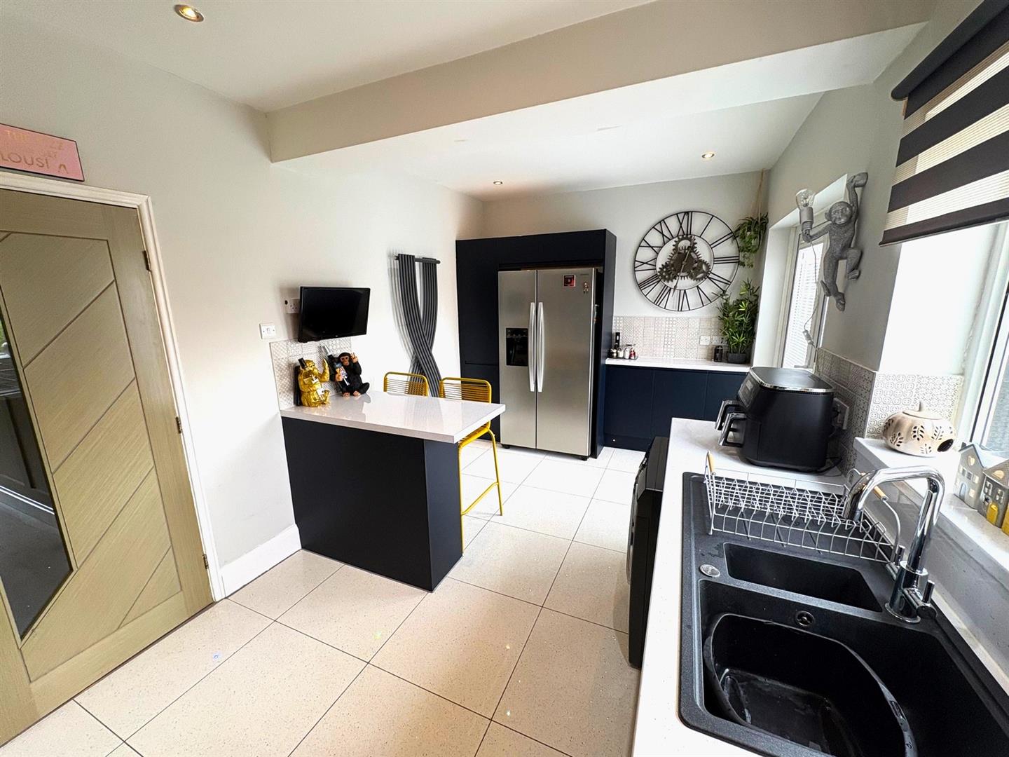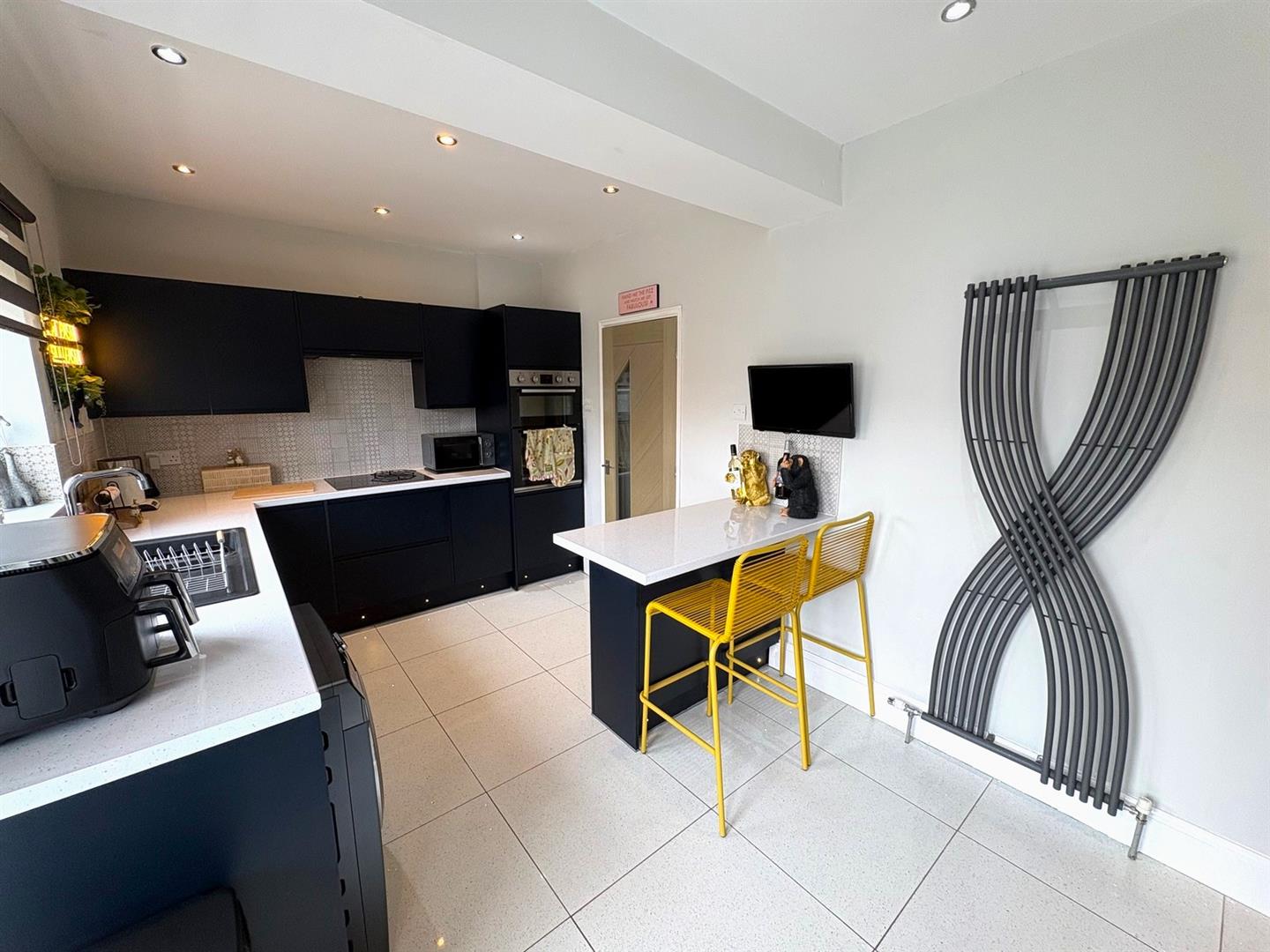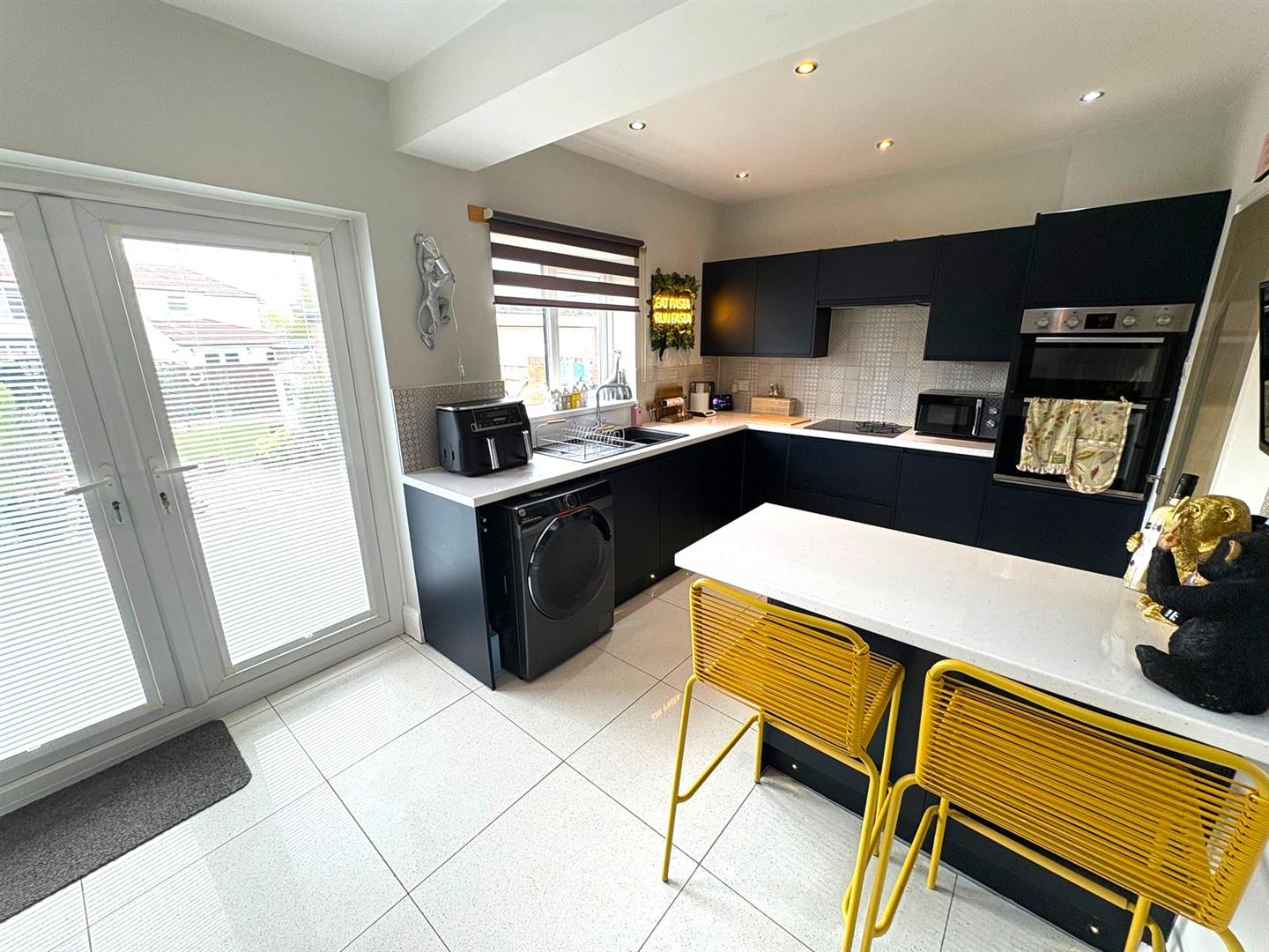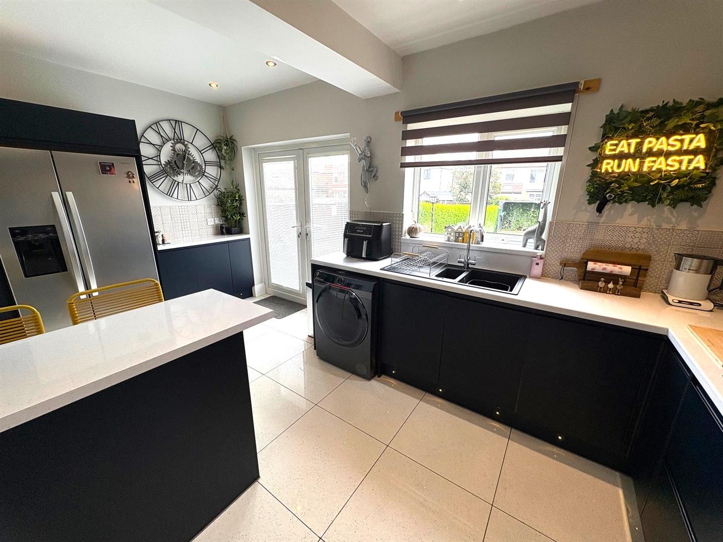 Rear aspect UPVC double glazed window and French doors opening to the garden. A range of modern navy base & wall units with contrasting white worksurfaces & tiled splashbacks incorporating a 1½ bowl sink unit & mixer tap, electric hob with extractor hood over and a built-in double oven. American style fridge/freezer, breakfast bar with stools, space & plumbing for washing machine, plinth lighting, tiled flooring, spotlights and a modern column radiator.