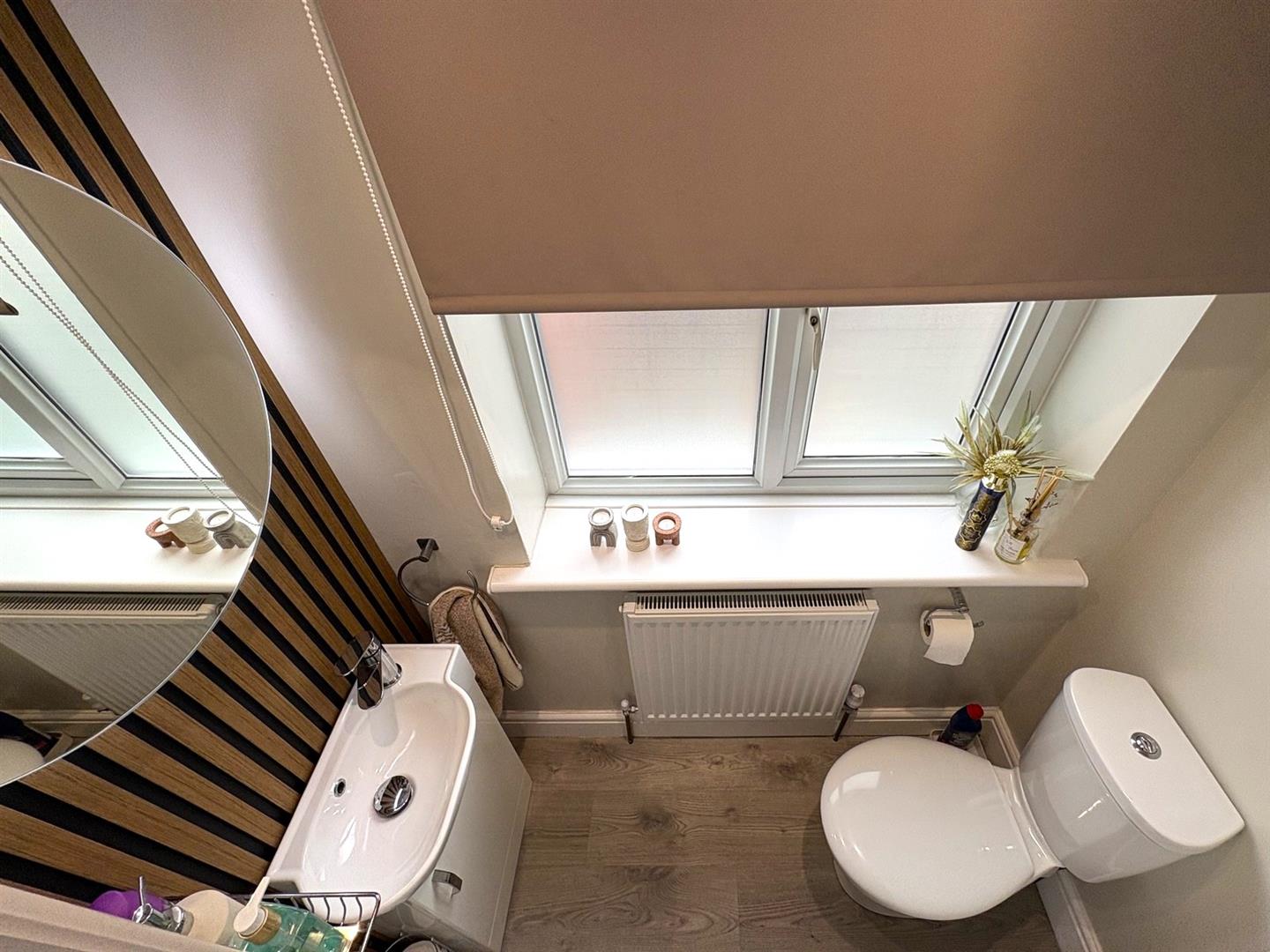 Cloaks/WCSide aspect UPVC double glazed window, vanity unit housing wash basin, low level WC, laminate flooring, spot lights and a radiator.