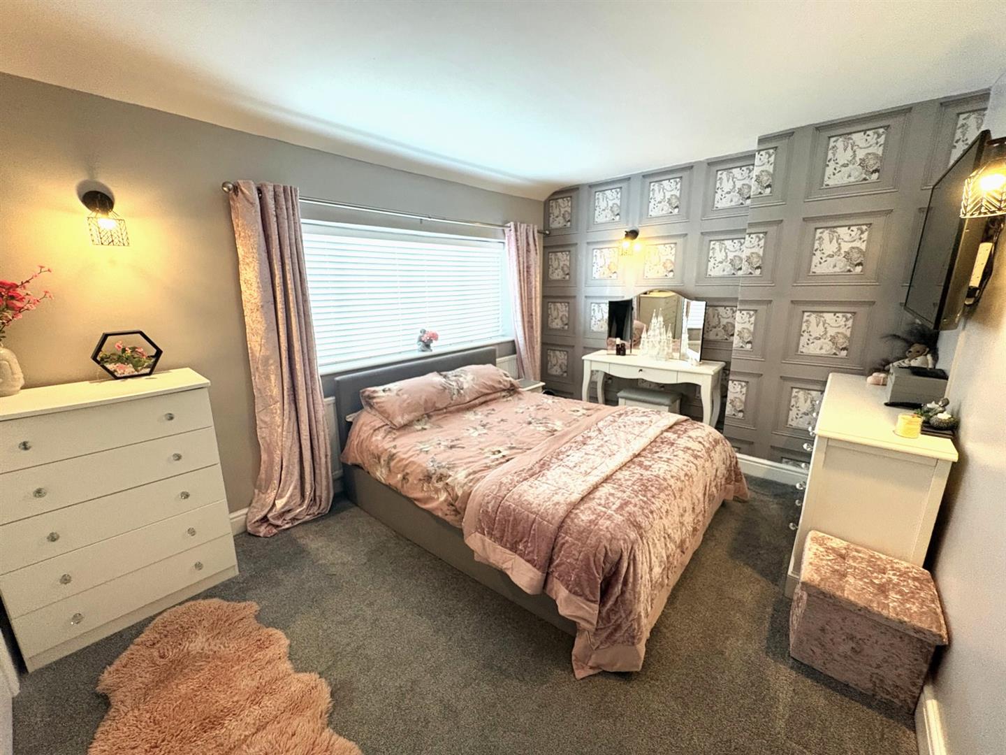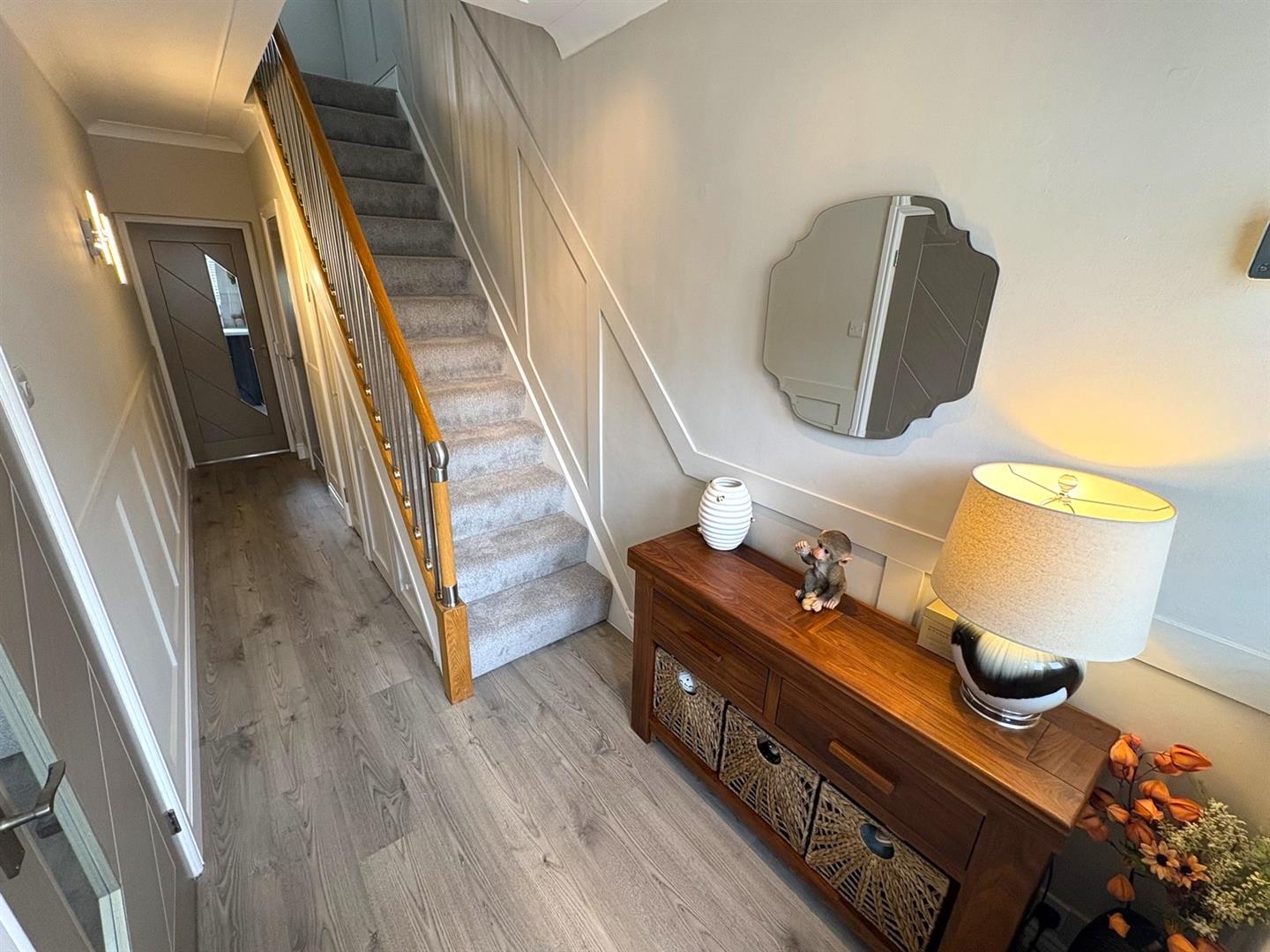 Entrance HallComposite entrance door with leaded lights and a UPVC double glazed window. Staircase to first floor, understair pullout storage drawers, laminate flooring, panelling to walls, coving and spotlights.