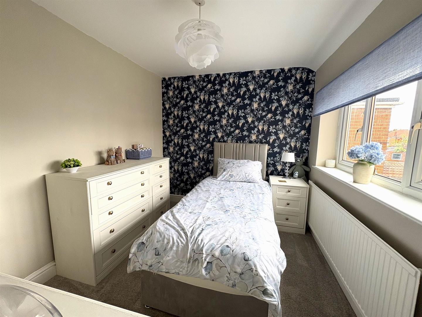 Front aspect UPVC double glazed window, walk-in wardrobe and a radiator.