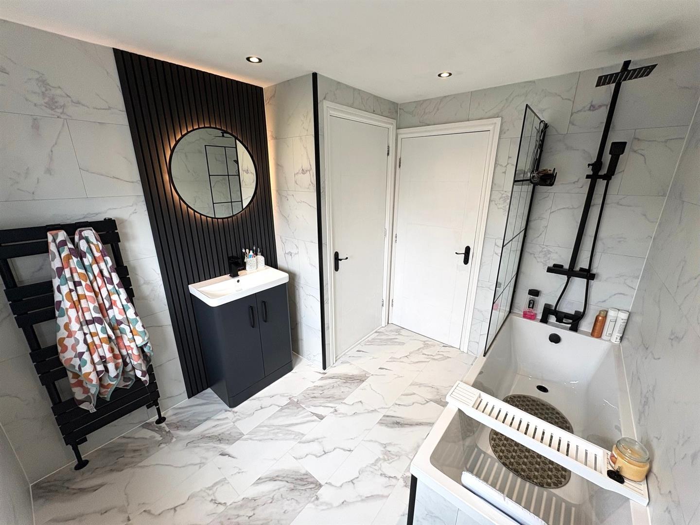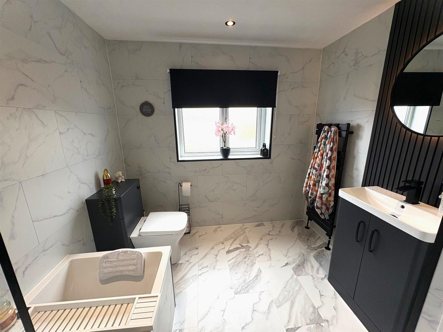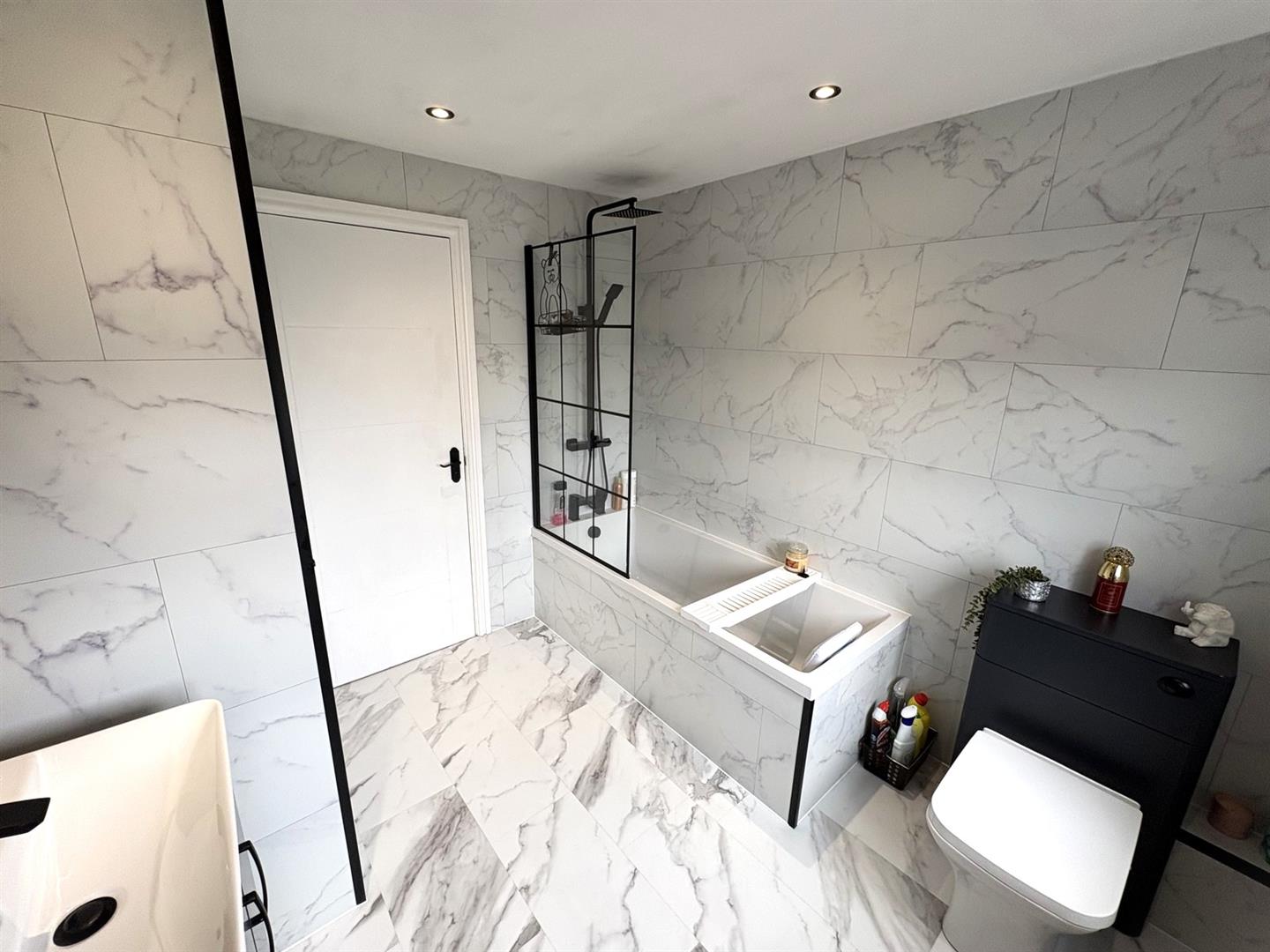 Rear aspect UPVC double glazed window, modern white suite comprising; panel enclosed bath with thermostatic mixer rainfall shower over, vanity unit housing wash basin and a low level WC with concealed cistern. White marble effect UPVC clad walls, matching flooring, spotlights, heated towel rail and a cupboard housing Baxi combi boiler.