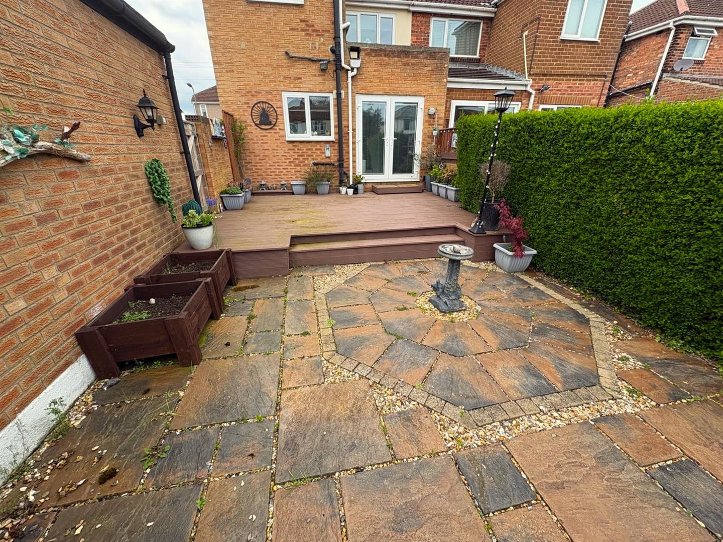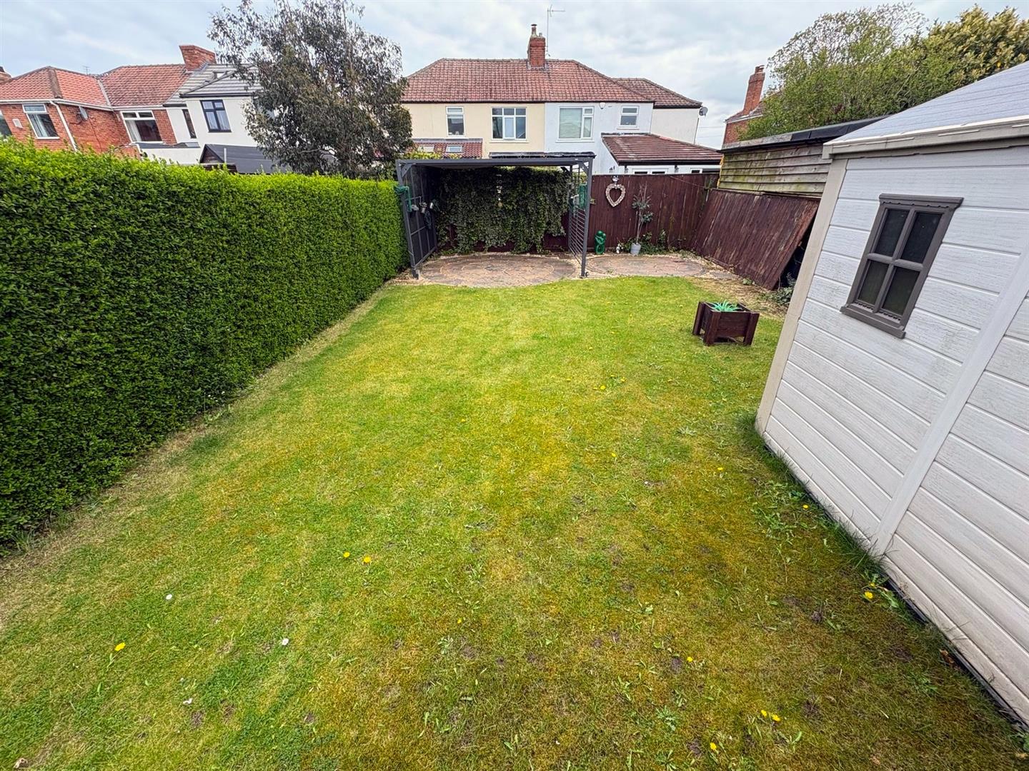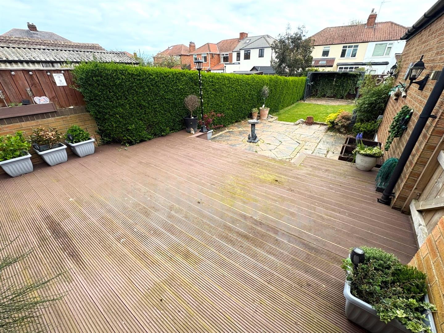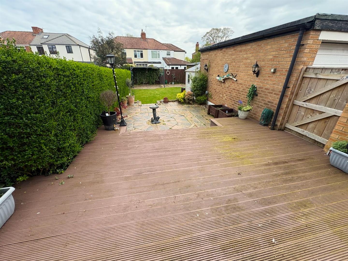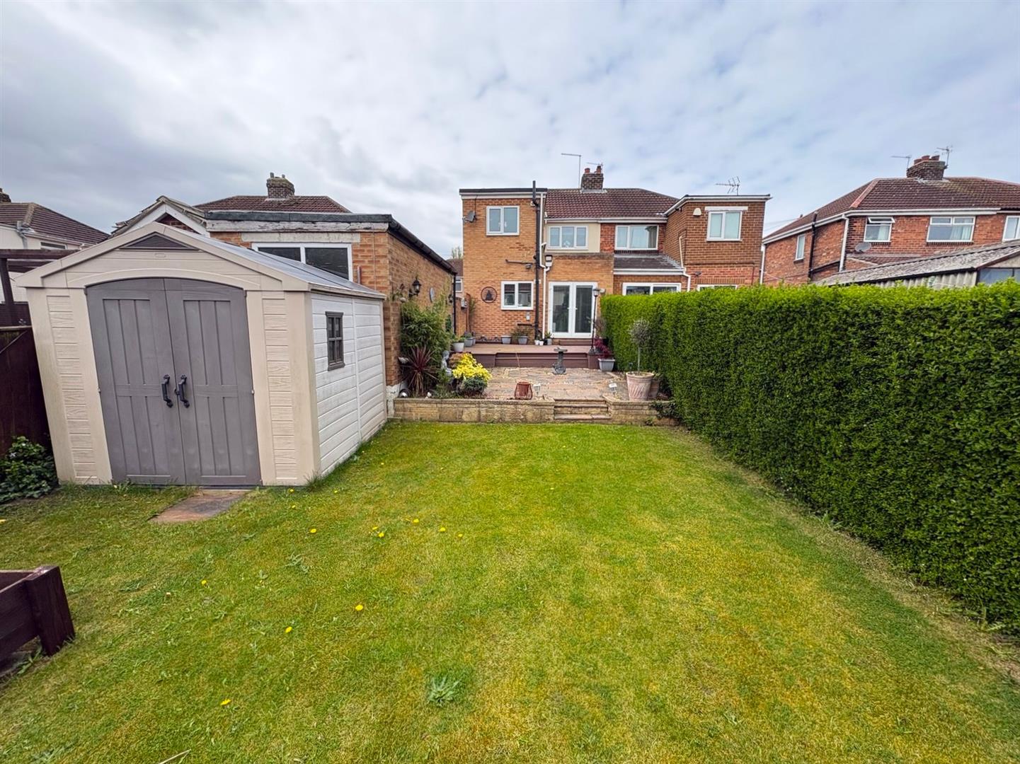 ExternallyThere is a walled front garden with established shrubs and a driveway providing off-street parking. Secure side access leads to a detached garage with up & over door. To the rear is a very generous enclosed garden with large decked, patio & lawned areas, a metal gazebo and large storage shed.