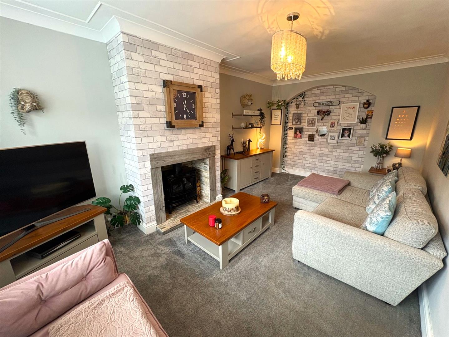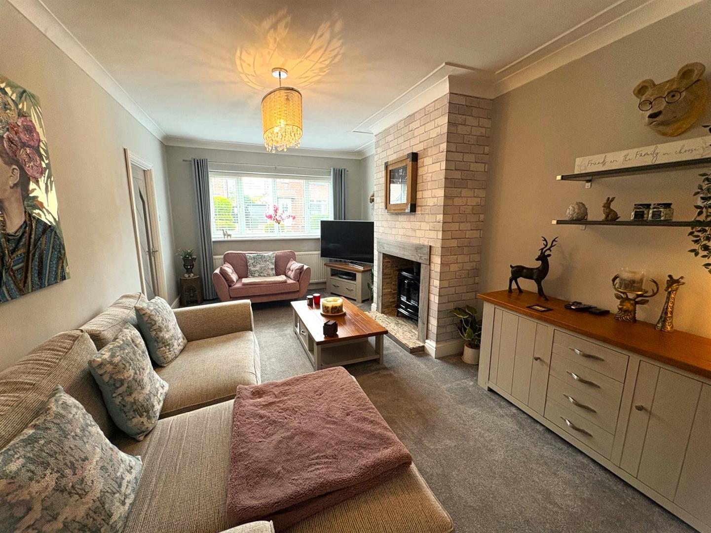 Front aspect UPVC double glazed window, feature fireplace with tiled hearth & an electric flame effect stove, coving to ceiling and a radiator.