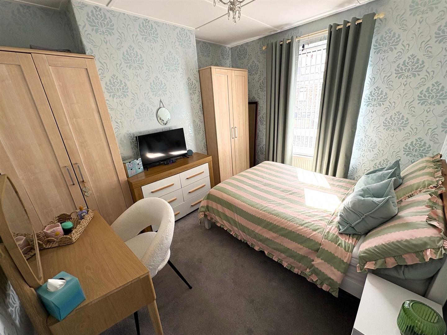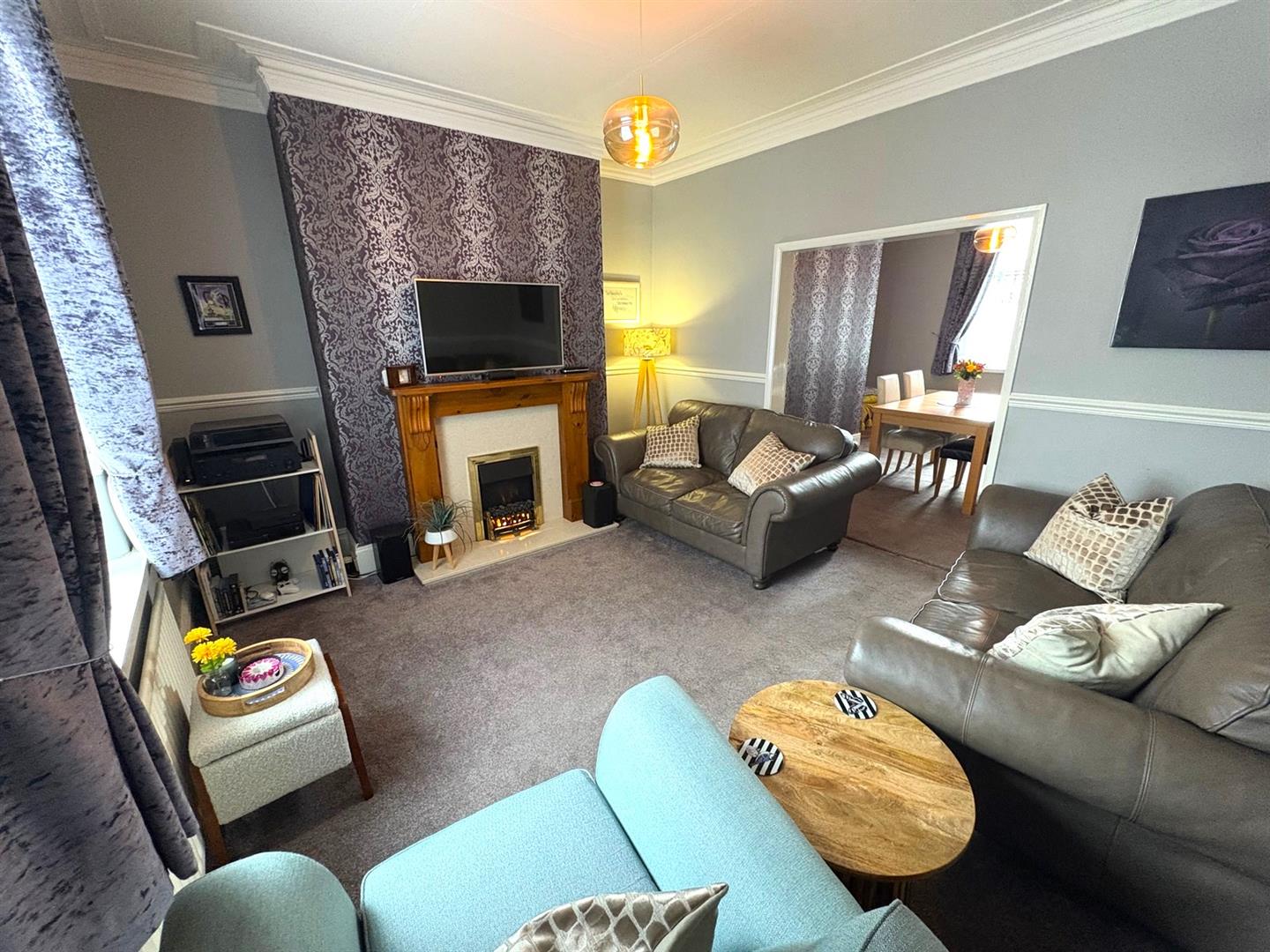 Front aspect UPVC double glazed window, feature fireplace with wooden surround, marble hearth & inset electric fire, dado rail coving and a radiator.