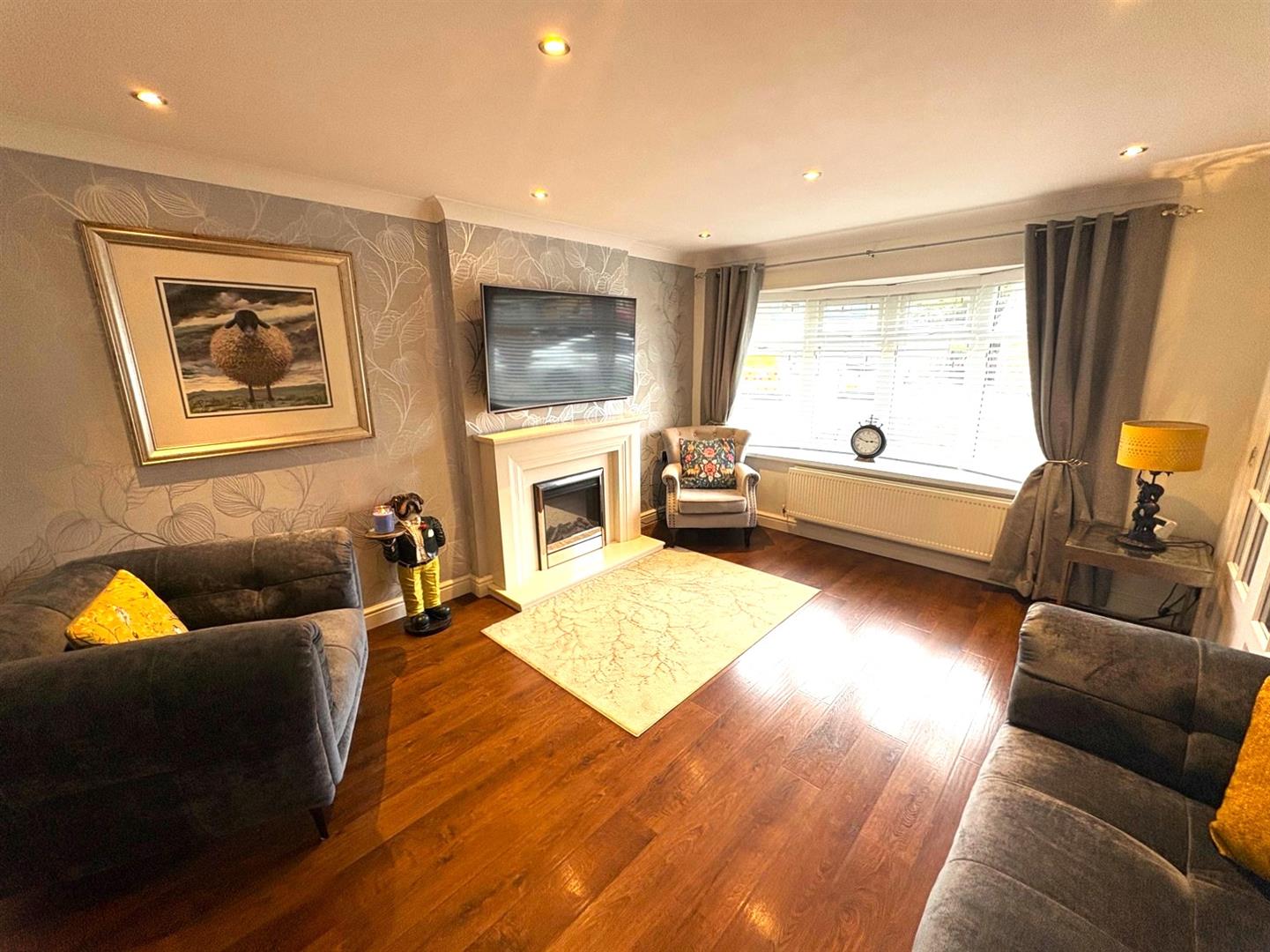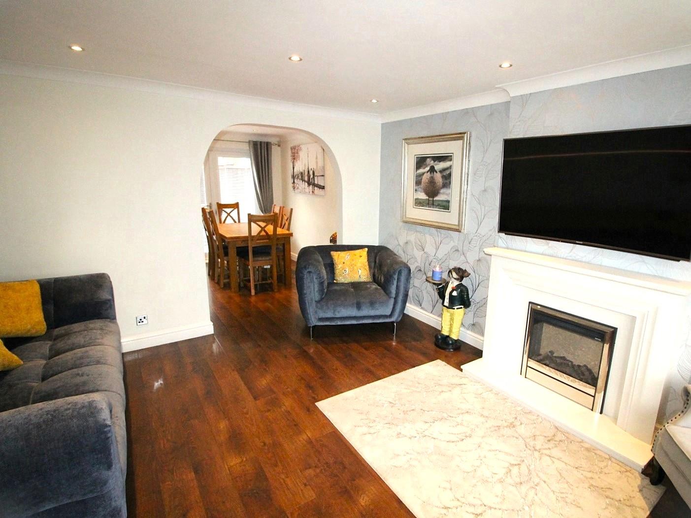 Front aspect UPVC double glazed bow window, marble feature fireplace with inset remote controlled electric fire, laminate flooring, understair storage cupboard, coving, spotlights, radiator and a archway leading to: