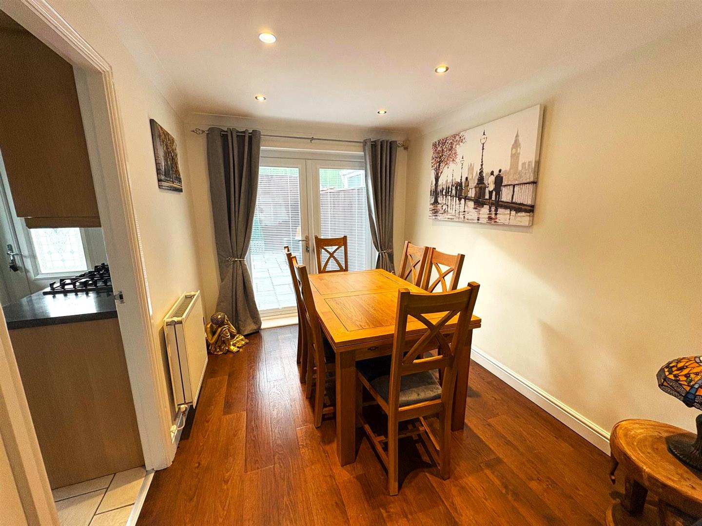 Rear aspect UPVC double glazed French doors opening to the garden, laminate flooring, understair storage cupboard, coving, spotlights and a radiator.