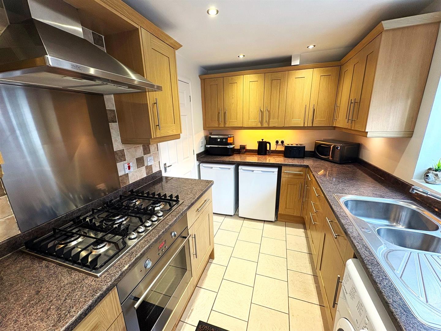 Side aspect UPVC double glazed window and a rear aspect UPVC door leading to the garden. A range base & wall units with rolled worksurfaces incorporating a Franke 1½ bowl stainless steel sink & mixer tap, 5-ring gas hob with oven below & stainless steel splashback & extractor hood over. Space & plumbing for washing machine, space for undercounter fridge & freezer, tiled floor and spots lights.